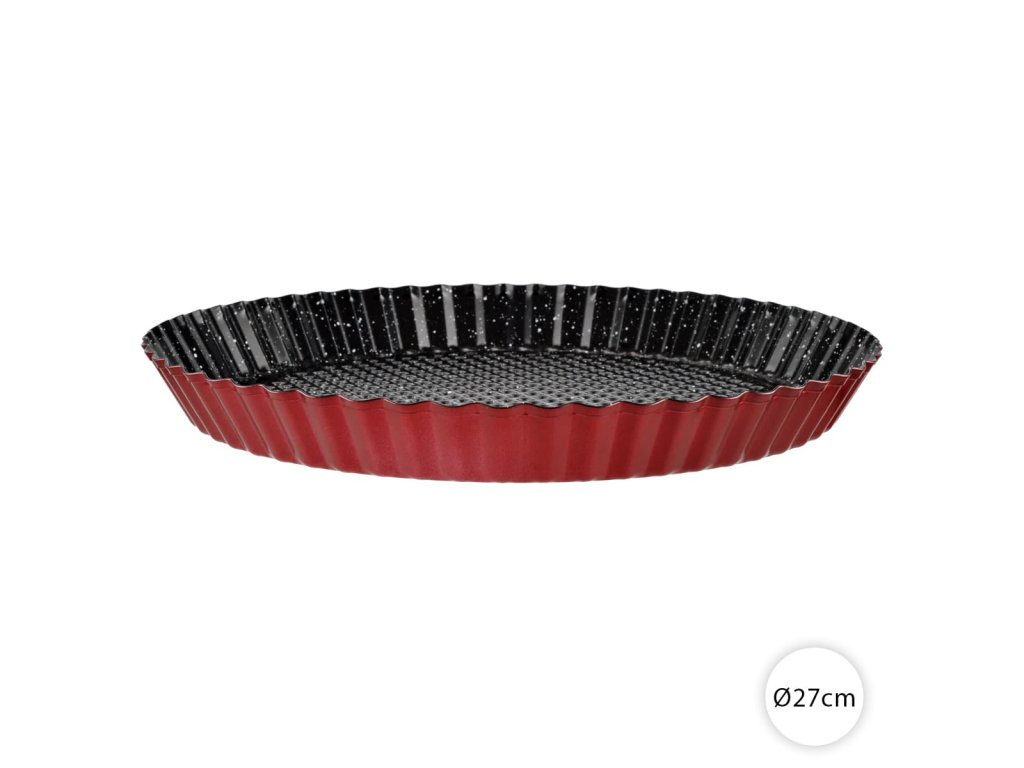 Forma na koláč 27 cm – kovová forma Perfect Home 19118 Metal Red s vlnitým okrajom a nepriľnavým povrchom. Ideálna na pečenie koláčov, priemer 27 cm, výška 3 cm, hmotnosť 240 g. Ľahko sa čistí v umývačke, bez škodlivých látok. Kvalitná forma na koláč pre domáce pečenie – objednajte si ju hneď a vychutnajte si dokonalé výsledky!