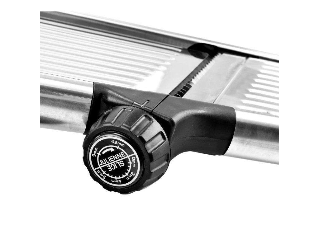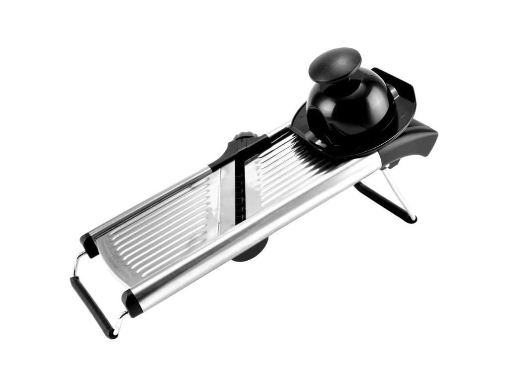 - Ako používať multifunkčný krájač: položte ho na rovný povrch, nasaďte chránič prstov na surovinu a rovnomerne prechádzajte po V-čepeli.