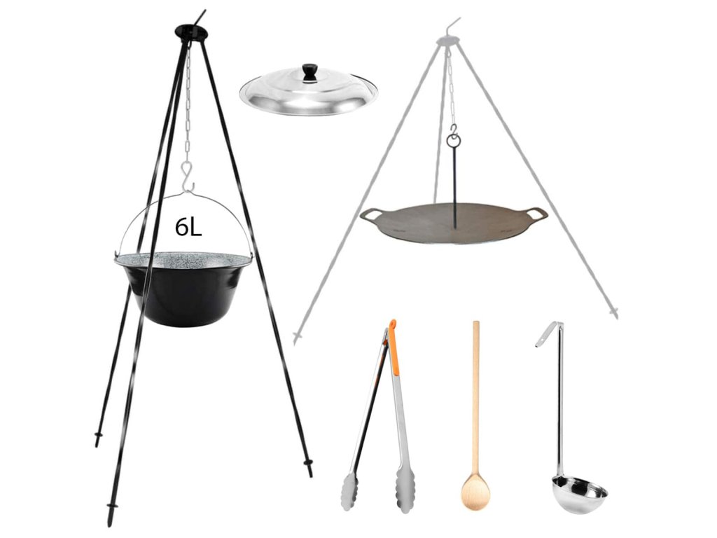 | Obsah sady: | trojnožka, kotlík, pokrievka, varecha, naberačka, grilovacie kliešte, grilovacia platňa |