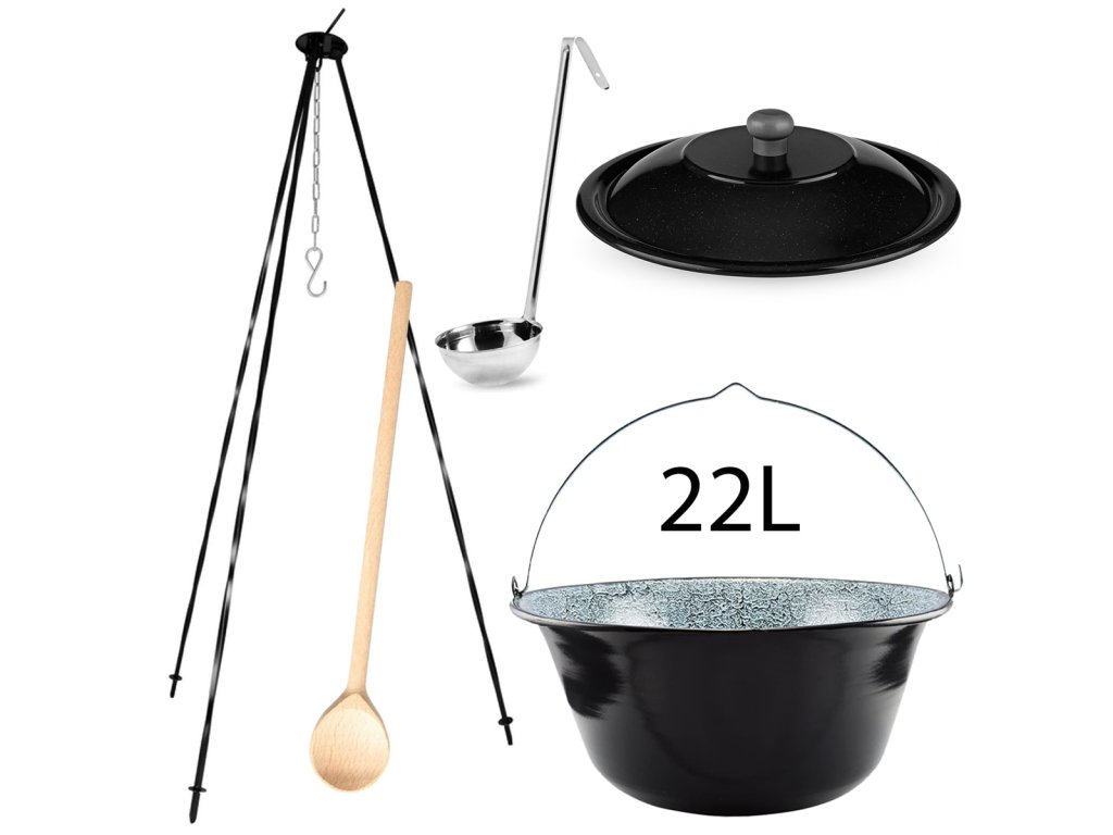 Perfect Home Kotlikset015 Trojnožka ku kotlíkom 1,24m + smaltovaný kotlík s pokrievkou 22 L + varecha + naberačka ZADARMO, 5 ks