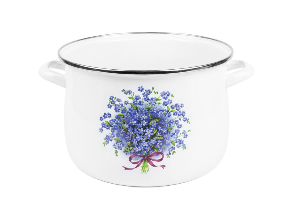 Smaltovaný hrniec s pokrievkou NEZÁBUDKA 5,5L je ideálny na varenie na všetkých typoch sporákov vrátane indukcie. S motívom nezábudiek v bielej farbe a svetlo modrou pokrievkou spája retro štýl s odolnosťou. Je hygienický, ľahko čistiteľný, šetrí energiu a zachováva chuť jedál.