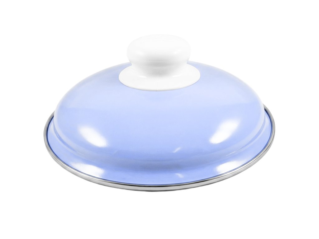 - Farby: hrniec biely s potlačou nezábudiek, vnútro biele; pokrievka svetlomodrá z oboch strán, nerezový lem