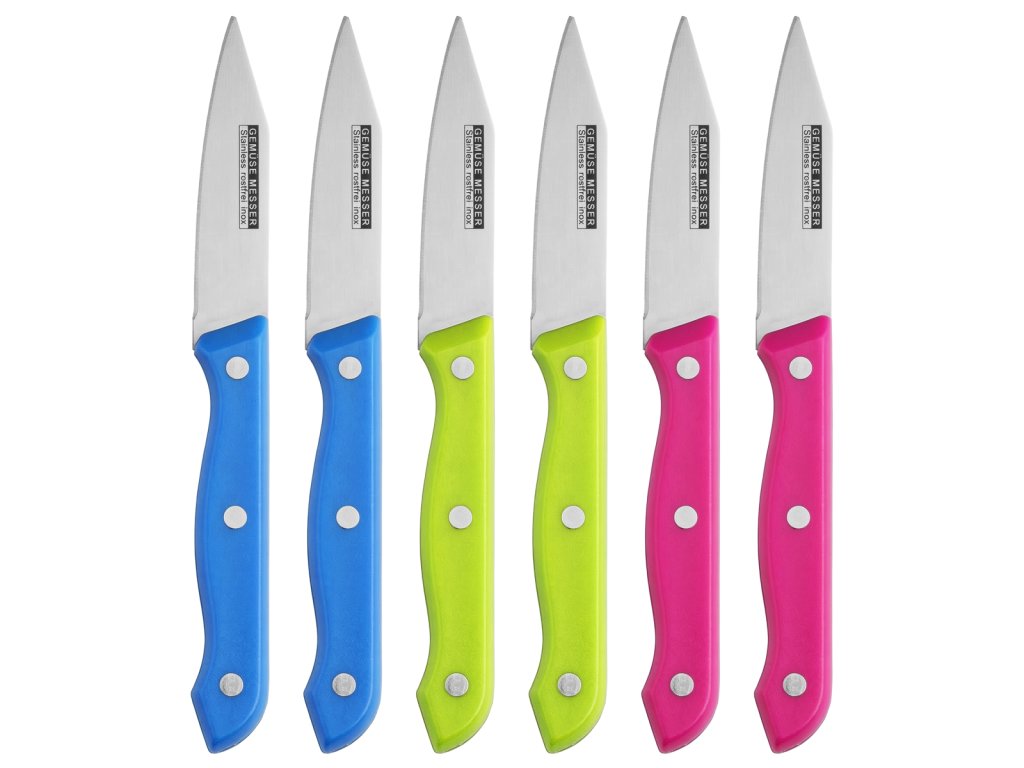 Táto sada nožov 6 dielna od značky Perfect Home obsahuje 6 nožov vyrobených z kvalitnej nehrdzavejúcej ocele s plastovou rukoväťou v rôznych farbách. Každý nôž má dĺžku čepele 8 cm a je určený na každodenné používanie v kuchyni – na krájanie zeleniny, ovocia alebo prípravu iných jedál. Balenie zahŕňa 6 ks nožov, ktoré sa zídu v akejkoľvek domácnosti.