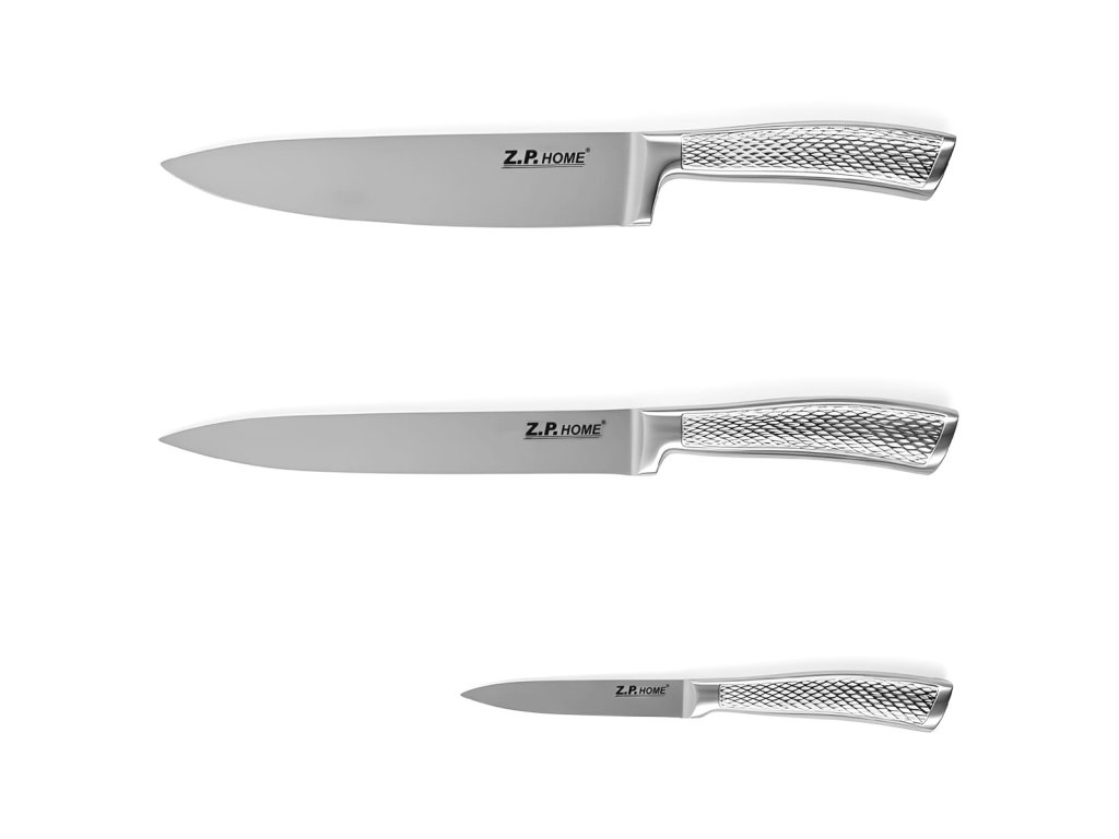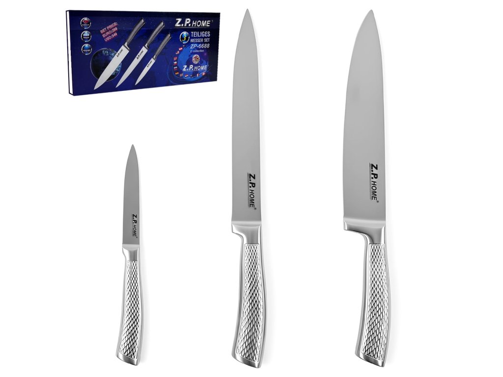 Sada kuchynských nožov 3ks z nerezu – Z.P.Home ZP-6688 | Nerezové nože. Táto kuchynská sada nožov obsahuje kuchársky, porcovací a univerzálny nôž z vysoko kvalitnej nehrdzavejúcej ocele. Celokovové, kované z jedného kusu s ergonomickými rukoväťami pre pohodlné používanie.