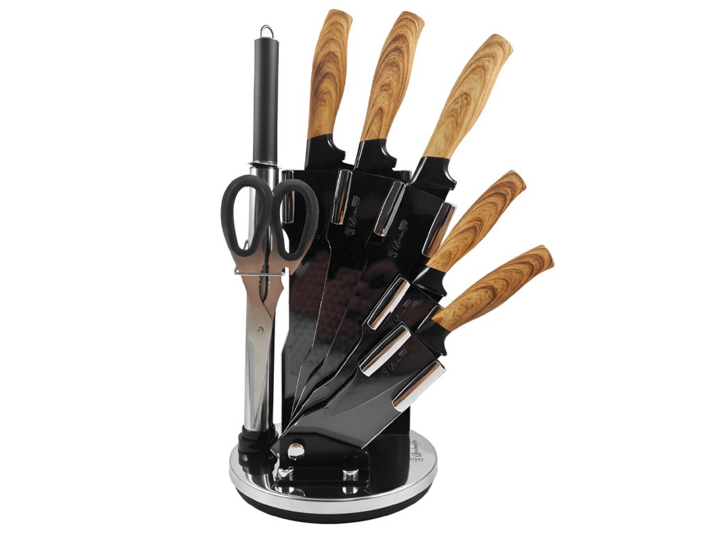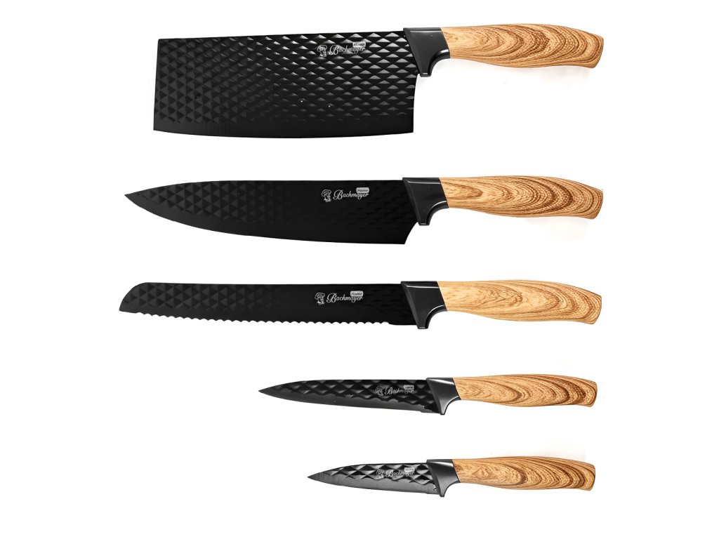 Elegantná sada kuchynských nožov Bachmayer BM-6802 (8 ks) s čiernymi čepeľami a rukoväťami s imitáciou dreva. Otočný blok, 5 nožov, nožnice, ocieľka. Nerez, dlhá životnosť. Darčekové balenie. Skvelý darček.